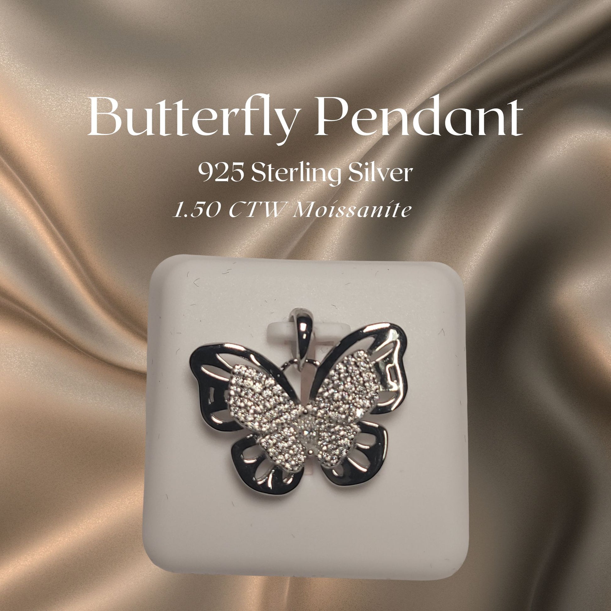 Take flight with this enchanting butterfly pendant, where 1.50 ctw of dazzling moissanite catches the light from every angle. Crafted in gleaming sterling silver, this whimsical design celebrates transformation and beauty in the most sparkly way possible. Whether you're a butterfly enthusiast or just love jewelry that makes you smile, this pendant is your ticket to effortless elegance with a fun twist. Spread your wings and shine!